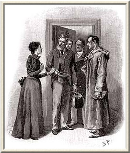 As we emerged from the sitting-room a woman, who had been waiting in the passage, took a step forward and laid her hand upon the Inspector's sleeve. Her face was haggard and thin and eager, stamped with the print of a recent horror.