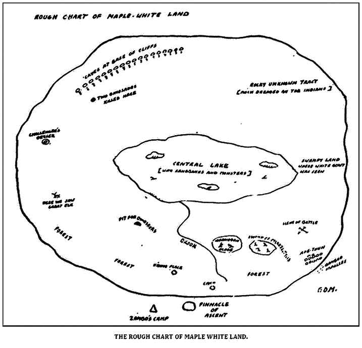 I should wish to place upon record here our gratitude to all our friends upon the Amazon for the very great kindness and hospitality which was shown to us upon our return journey. Very particularly would I thank Senhor Penalosa and other officials of the Brazilian Government for the special arrangements by which we were helped upon our way, and Senhor Pereira of Para, to whose forethought we owe the complete outfit for a decent appearance in the civilized world which we found ready for us at that town. It seemed a poor return for all the courtesy which we encountered that we should deceive our hosts and benefactors, but under the circumstances we had really no alternative, and I hereby tell them that they will only waste their time and their money if they attempt to follow upon our traces. Even the names have been altered in our accounts, and I am very sure that no one, from the most careful study of them, could come within a thousand miles of our unknown land.
