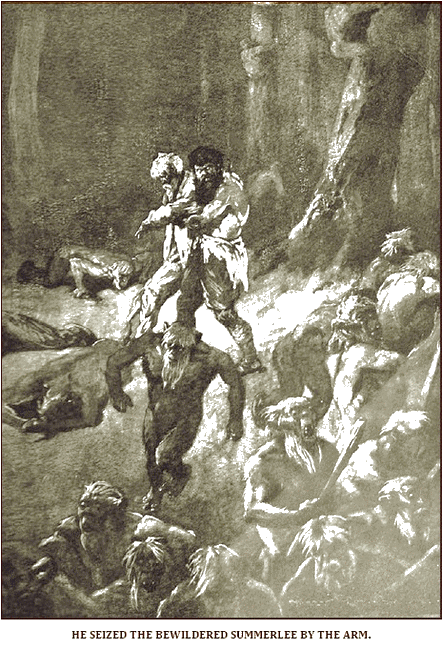 What we did we had to do quickly and secretly, since even at this last hour the Indians might hold us back. Our stores we would leave behind us, save only our guns and cartridges. But Challenger had some unwieldy stuff which he ardently desired to take with him, and one particular package, of which I may not speak, which gave us more labor than any. Slowly the day passed, but when the darkness fell we were ready for our departure. With much labor we got our things up the steps, and then, looking back, took one last long survey of that strange land, soon I fear to be vulgarized, the prey of hunter and prospector, but to each of us a dreamland of glamour and romance, a land where we had dared much, suffered much, and learned much—OUR land, as we shall ever fondly call it. Along upon our left the neighboring caves each threw out its ruddy cheery firelight into the gloom. From the slope below us rose the voices of the Indians as they laughed and sang. Beyond was the long sweep of the woods, and in the center, shimmering vaguely through the gloom, was the great lake, the mother of strange monsters. Even as we looked a high whickering cry, the call of some weird animal, rang clear out of the darkness. It was the very voice of Maple White Land bidding us good-bye. We turned and plunged into the cave which led to home.